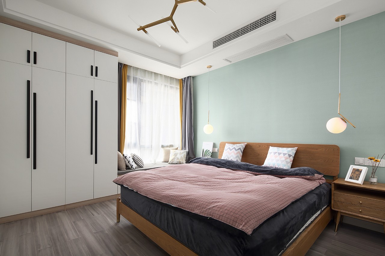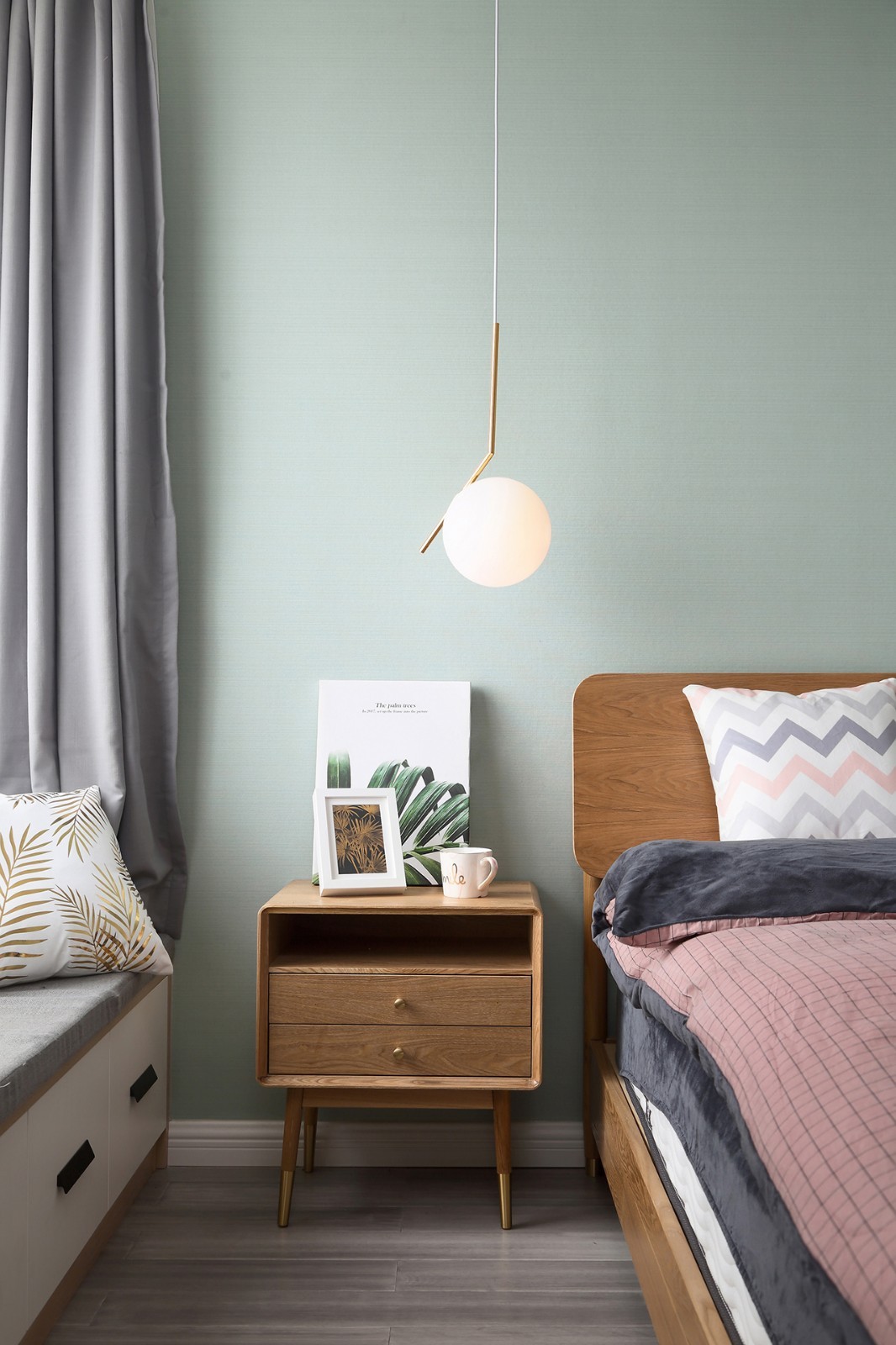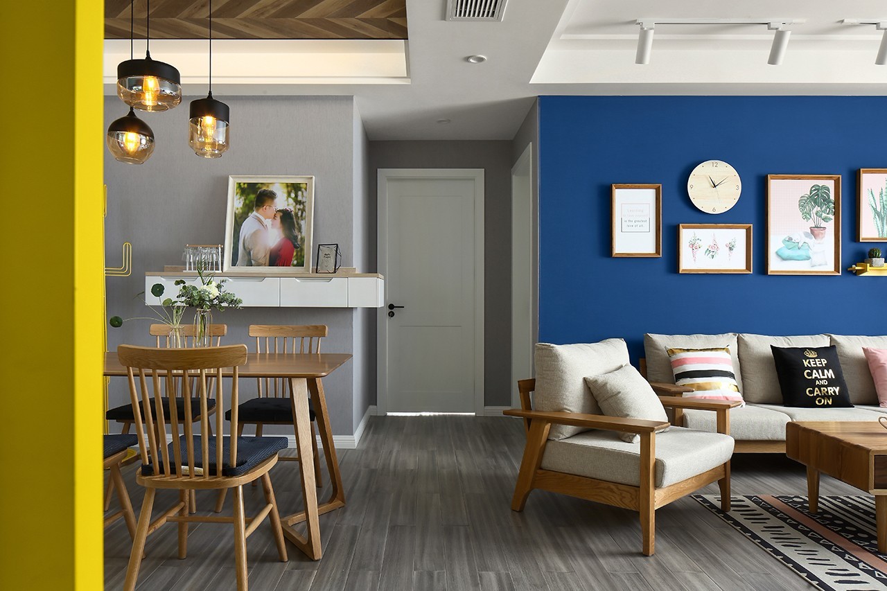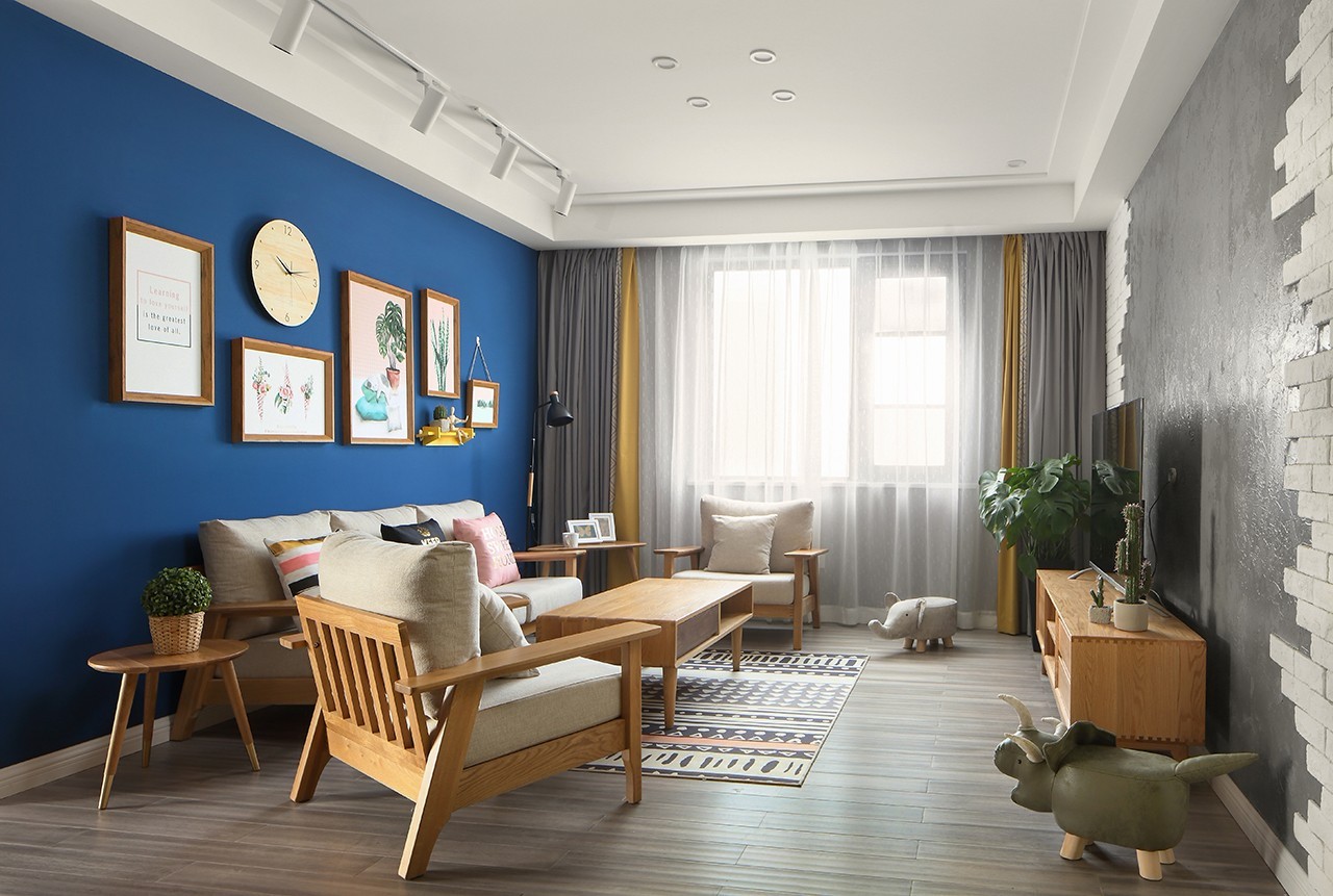 原木色布藝沙發(fā)撞色深藍(lán)色墻布的背景,突出木作家居給予空間的原生態(tài)環(huán)境