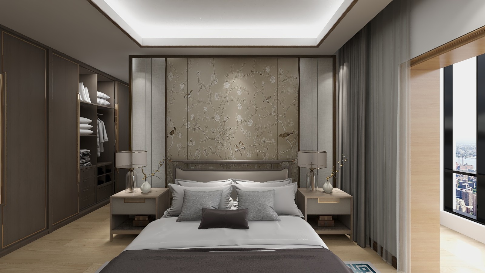 飛鳥(niǎo)意境的墻布搭配暖色性的木飾面襯托出家的溫馨