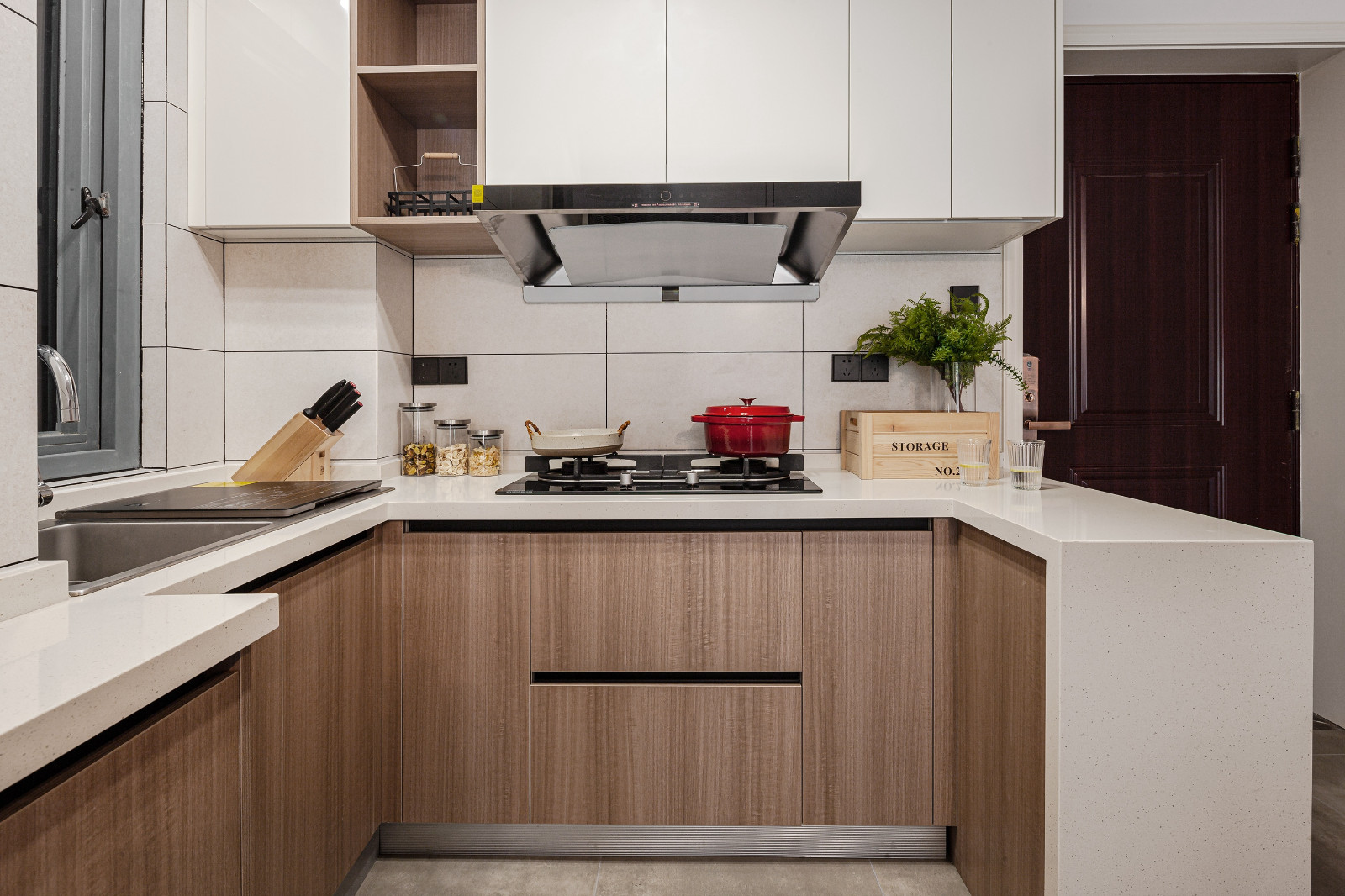 L型開放式廚房設計,充分利用轉角空間,合理布局。白色吊柜柜門+墻磚,搭配木紋櫥柜,色彩清爽簡約。